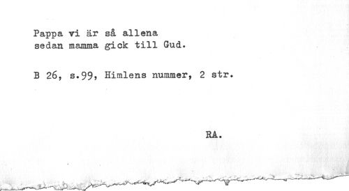 //// Pappa vi är så allena sedan mamma gick till Gud. //// B 26, s.99> Himlens nummer, 2 str. //// RA. //// # //// ^ ... ////