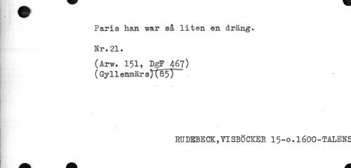 //// Paris han war så liten en dräng. Nr.21. //// (Arw. 151, DgF 467) (Gyllenmärs)~C85) //// .« 1 y ^x //// 1 //// RUDEBECK,VISBÖCKER 15-0.1600-TALENS ////