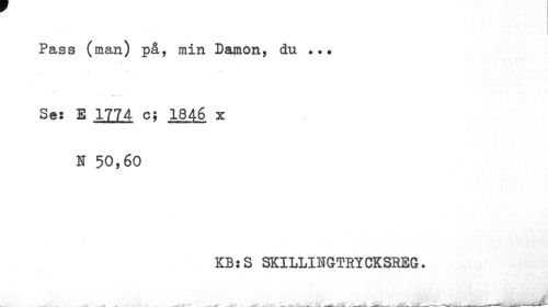 //// Pass (man) på, min Damon, du ... //// Se: E 1774- cj 1846 x I 50,60 //// KB:S SKILLIHGTRYCKSREG. ////