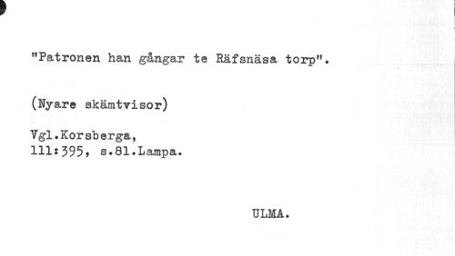 //// "Patronen han gångar te Räfsnäsa torp". //// • ' Sv //// (Nyare skämtvisor) //// Vgl.Korsberga, 111: //// 395> s.81.Lampa. //// i //// , i //// ULMA. ////