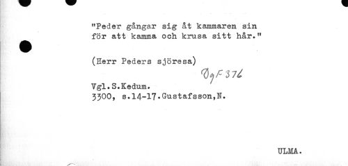 //// "Peder gångar sig åt kammaren sin ^^ för att kamma och krusa sitt hår.11 //// (Herr Peders sjöresa) //// Vgl.S.Kedum* //// 3300, s.14-17.Gustafsson,N. //// ULMA. ////