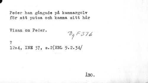 //// Peder han gångade på kammargolv för att putsa och kamma sitt hår //// Visan om Peder. //// Ty F 3 7 é //// m //// 12:4, INE 37, s.2(HBL 9-2.34/ //// ÅBO. ////