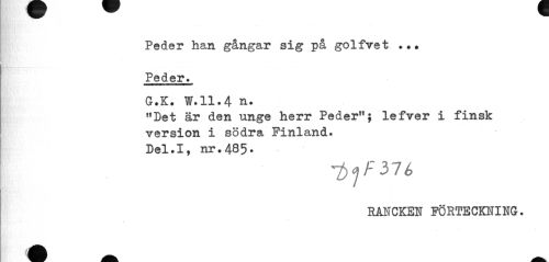 //// Peder han gångar sig på golfvet .•• Peder. //// G.K. W.11.4 n. //// "Det är den unge herr Peder"; lefver i finsk version i södra Finland. //// Del.I, nr.485* //// RANCKEN FÖRTECKNING. ////