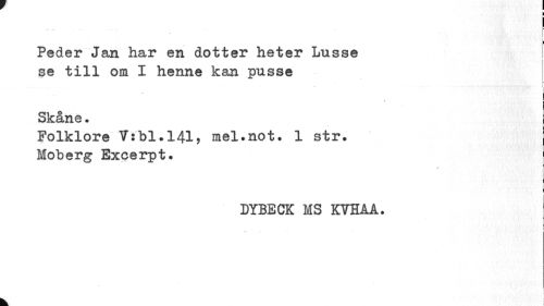 //// ¦ I //// ... • t //// Peder Jan har en dotter heter Lusse [ //// se till om I henne kan pusse j //// r //// % L //// Skåne. //// Folklore V:bl.141, mel.not. 1 str. //// Moberg Excerpt. | //// DYBECK MS KYHAA. //// k ////