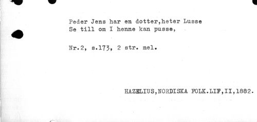//// Peder Jens har en dotter,heter Lusse ^^ Se till om I henne kan pusse, //// Nr.2, s.173, 2 str. mel. //// HAZELIUS,NORDISKA FOLK.LIF,II,1882. ////