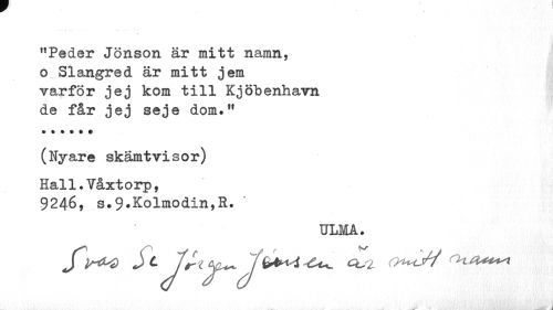 //// "Peder Jonson är mitt namn, o Slangred är mitt jem varför jej kom till Kjöbenhavn de får jej seje dom." //// (Nyare skämtvisor) //// Hall.7åxtorp, 9246, s.9.Kolmodin,R. //// ULMA. //// J^WÖ St Jriy^ cta o^ué/ ////