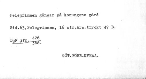 //// Pelegrimmen gångar på konungens gård Sid.63,Pelegrimmen, 16 str.Arw.tryckt 49 B. //// ¦n T. • - 426 //// s. //// \ //// GÖT.FÖBB.KYHAA. //// ___ ___ ___I___ ii ////