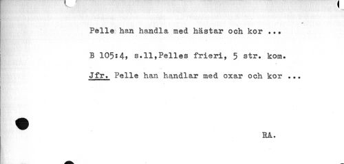 //// — «J //// 0 //// Pelle han handla med hästar och kor ••• //// B 105^4, s.11,Pelles frieri, 5 str» kom» Jfr. Pelle han handlar med oxar och kor ... //// HA. ////
