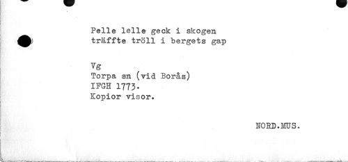 //// # //// Pelle lelle geck i skogen träffte troll i bergets gap //// Yg //// Torpa sn (vid Borås) //// IFGH 1773- //// Kopior visor» //// NORD.MUS. ////