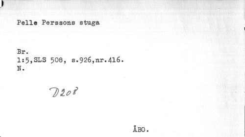 //// r //// Pelle Perssons stuga //// ! //// • i I //// i | //// '¦ '.i' :'--'.¦';'. 'ti : j i //// Br. i //// i //// 1:5,SLS 508, s.926,nr.416. i //// K. //// i //// Dlot //// \ i I //// ÅBO. ////