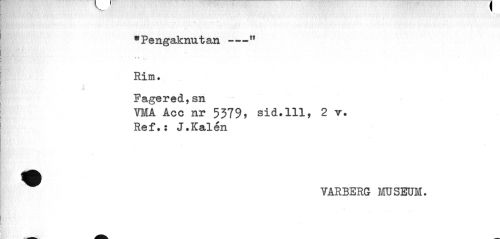 //// "Pengaknutan---11 //// Rim. //// / //// Fagered,sn //// VMA Acc nr 5379> sid.111, 2 r. //// Ref.: J.Kalén //// ^ VARBERG MUSEUM. ////