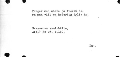 //// Pengar man måste på fickan ha, om man Till en hederlig fylla ha. //// / //// Svenssons saml.häfte, 4:4.? Nr 27, s.180. //// ÅBO. //// i '•'.' ////
