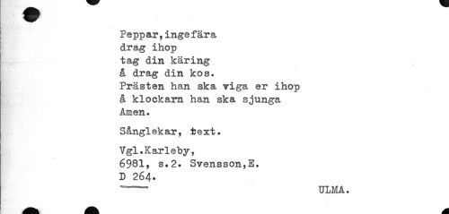 //// • I //// 1 //// \ K //// Peppar,ingefära //// drag ihop //// tag din käring //// å drag din kos. //// Prästen han ska viga er ihop //// å klockarn han ska sjunga //// Amen. //// Sånglekar, text. //// Vgl.Karleby, //// 6981, s.2. Svensson,E. //// D 264* //// ---ULMA. //// ^^ ^^ M ////