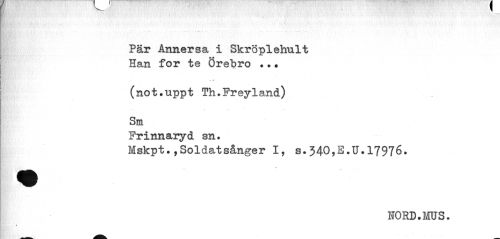 //// fr //// Wmi • ... //// Pär Annersa i Skröplehult //// Han for te Örebro .?« //// ••• //// Bowld&vaA //// (not.uppt Th.Freyland) //// t • ¦' //// Sm //// Frinnaryd sn. //// Mskpt.,Soldatsånger I, s.340,E.U.17976. //// NORD.MUS. ////