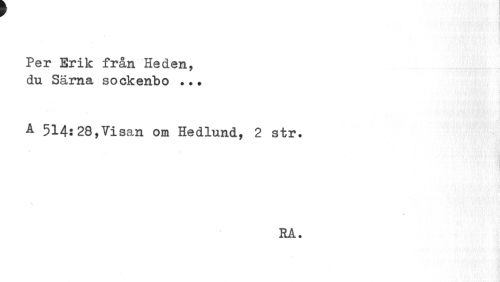 //// w \ //// Per Erik från Heden, du Särna sockenbo . //// A 514:28,Visan om Hedlund, 2 str. //// \ //// RA. ////