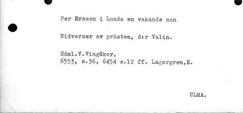 //// Per Ersson i Lunda en vakande man Nidverser av prästen, d:r Valin. Sdml?V.Vingåker, //// 6553, s.36, 6454 s.12 ff. Lagergren,E. //// ULM A. //// ___W,___—---———---— —— — — —-—¦—— —...——~--- ////