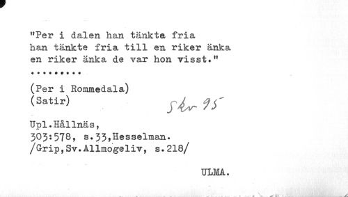 //// "Per i dalen han tänkta fria han tänkte fria till en riker änka en riker änka de var hon visst.M //// (Per i Rommedala) //// (Satir) y^ ff //// Upl.Hållnäs, //// 303:578^ s.33,Hesselman. /Grip,Sv.Ållmogeliv, s.218/ //// TJLMÅ. //// kl • -i ¦ -r.j •^ /'•é . v; • j 1 ^ ////