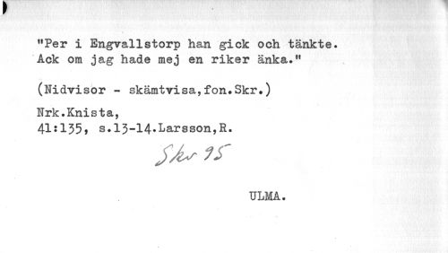 //// "Per i Engvallstorp han gick och tänkte. Ack om jag hade mej en riker änka." //// (Eidvisor - skämtvisa,fon#Skr.) Wrk.Knista, //// 41:135* s?13-14.Larsson,E. //// TJLMA. ////