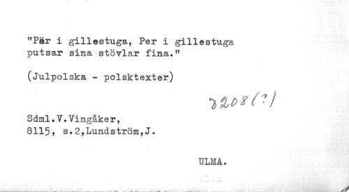//// "Par i gillestuga, Per i gillestuga putsar sina stövlar fina." //// (Julpolska - polsktexter) //// Sdml.V.Vingåker, 8115y s.2,Lundström,J. //// ULMA. //// ___. ___' ___ ___. ^ ___ ^ ... . - ... - -- ... ////