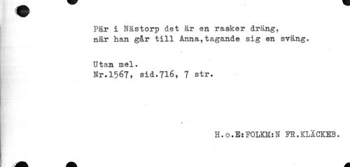//// fl ^ //// Pär i Näs torp det är en rasker dräng, när han går till Anna, tagande sig en sväng. //// Utan mel. //// Nr.1567, sid.716, 7 str. //// H.o.E:FOLKM:N PH.KLÄCKEB. //// i .^H Hk, ^H ^ ^H ////