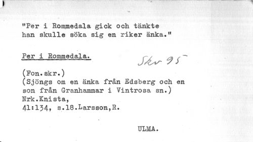 //// "Per i Rommedala gick och tänkte han skulle söka sig en //// Stiller # //// t //// Per i Rommedala. ^ / //// (Fon.skr.) //// (Sjöngs om en änka från Edsberg och en son från Granhammar i Vintrosa sn.) Hrk.Knista, //// 41:134» s.18.Larsson,R. //// v //// ULMA. ////