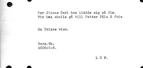 //// Per Jinsas Carl han klädde sig så fin. För han skulle gå till Petter Påls å fria //// En friare visa. //// Bara.Sk. //// 4606:6-8. //// % //// LO. ////