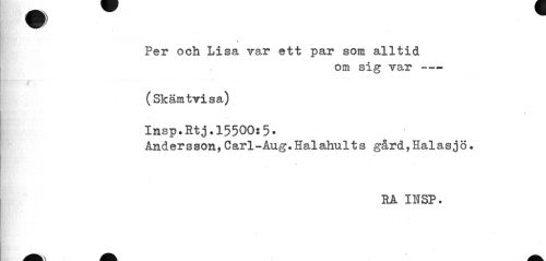 //// « //// Per och Lisa var ett par som alltid //// om sig var -— //// (Skämtvisa) //// Insp.Rtj.15500s 5* //// Andersson,Carl-Aug.Halahults gård,Halasjö. //// # //// RA IMSP. ////