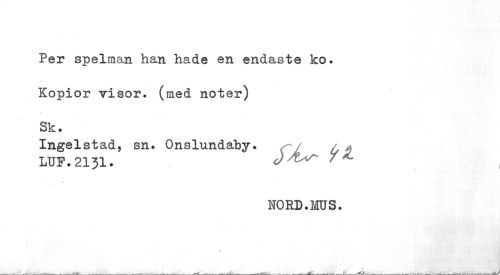 //// Per spelman han hade en endaste ko. Kopior visor, (med noter) //// Sk. //// Ingelstad, sn. Onslundaby. / //// LUF.2131. Jfar 7 «- . //// HORD.MUS. ////