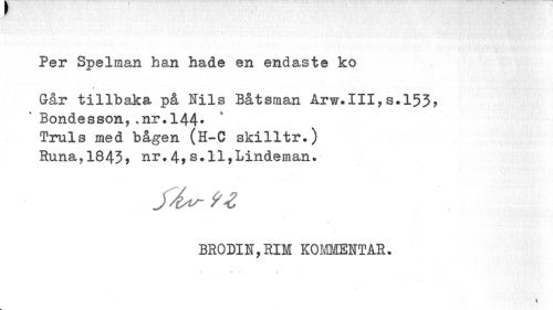 //// Per Spelman han hade en endaste ko //// « //// Går tillbaka på Nils Båtsman Årw.III,s.153> Bondesson,,nr.144* //// Truls med bågen (h-c skilltr.) Runa,1843, 4> s.11,Lindeman. //// fsiu-11 //// brodin,rim kommentar. //// I ////