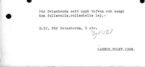 //// Pär Svinaherde satt uppå tufvan och sang: ^^ Kora falleralle,rallerielle lej,- //// S.32, Pär Svinaherde, 6 str. //// « //// LARSON,F0LKV.1908. ////