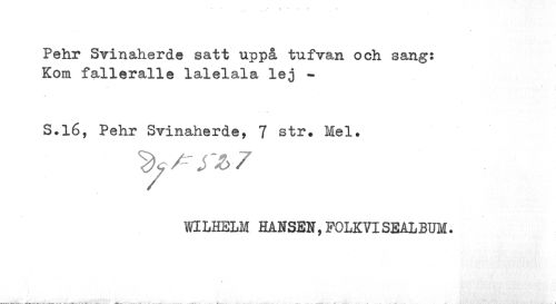 //// Pehr Svinaherde satt uppå tufvan och sang: Kom falleralie lalelala lej - //// S.l6, Pehr Svinaherde, 7 str. Mel. //// WILHELM HANSEN,FOLKYISEALBUM. //// * ////
