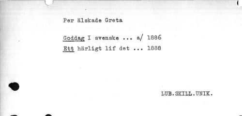 //// - v //// i //// Per älskade Greta //// Goddag I svenske ... a/ 1886 Ett härligt lif det ... 1888 //// LUB:. SKI LL. UNIK. ////