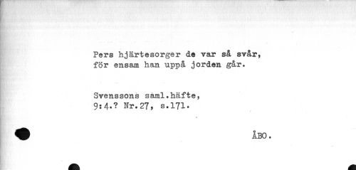 //// Pers hjärtesorger de var så svår, //// för ensam han uppå jorden går. //// Svenssons saml.häfte, //// 9:4»? Nr.27, s.171. //// 0 ////