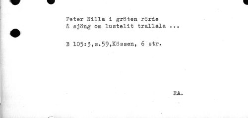 //// Peter Nilla i gröten rörde ^^ å sjöng om lustelit trallala ... //// B 105:3,s.59,Kössen, 6 str. //// RA. //// ¦ • • ^ //// 1 //// -¦¦'•v.. ////