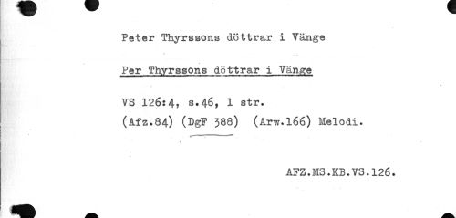 //// Peter Thyrssons döttrar i Vänge //// 9 //// Per Thyrssons döttrar i Vange //// VS 126:4, S.46, 1 str. //// (Afz.84) (Dg? 388) (Arw.166) Melodi. //// • % //// AFZ.MS.KB.VS.126. ////