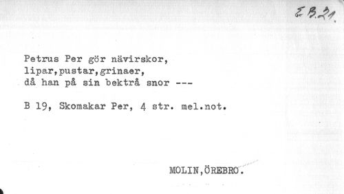 //// t //// Petrus Per gör nävirskor, //// lipar,pustar,grinaer, //// då han på sin bektrå snor --- //// B 19, Skomakar Per, 4 str. mel.not. //// MOLIN,ÖREBRO. //// * * * M * v» ////