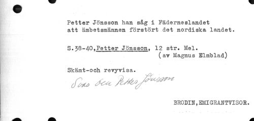 //// Petter Jönsson han såg i Fäderneslandet //// att ämbetsmännen förstört det nordiska landet. //// S»58-40»Petter Jonsson, 12 str. Mel. //// (av Magnus Elmblad) //// Skämt-och revyvisa. //// BRODIN,EMIGRANTVISOR. //// u • 1 //// i . % ... //// ÅMI Ih, ^H HK ^H ////
