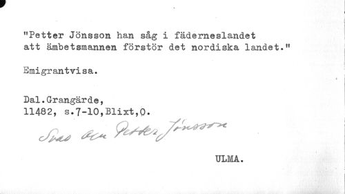 //// ( //// "Petter Jönsson han såg i fäderneslandet att ämbetsmannen förstör det nordiska landet." //// Emigrantvisa. //// Dal.Grangärde, 11482, s.7-10,Blixt,0. //// i //// ULMA. //// ¦ v f //// I //// I //// ' '. .' ,•• ¦ ilSti i' ¦ - '¦.-.'.. I ////