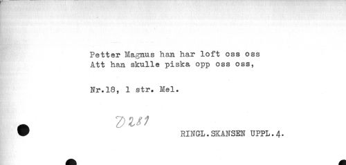 //// Petter Magnus han har loft oss oss Att han skulle piska opp oss oss, //// Nr.18, 1 str. Mel. //// Ä 7)ZS1 //// W RINGL.SKANSEH UPPL.4• ////