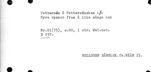 //// % //// Pettersén å Pettersénskan 1//1 Fyra rynkor fram å lika många bak //// Nr.81(75), s.80, 1 str. Mel.not. //// D 237. //// HELLGREN SÅNGLEK.fr.NÄÄS II. //// MH ////