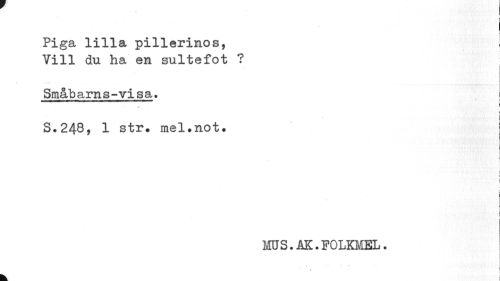 //// E //// i //// Piga lilla pillerinos, //// Vill du ha en sultefot ? , //// Sm&barns-vi sa. //// i //// * r //// i //// S.248, 1 str. mel.not. //// ¦ //// 1 //// j //// i //// MS. AK. FOLKMEL. //// k ////