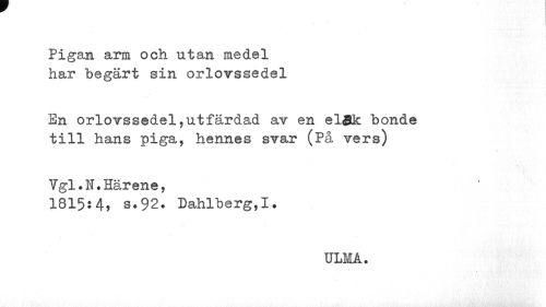 //// Pigan arm och utan medel har begärt sin orlovssedel //// En orlovssedel,utfärdad av en elfik bonde till hans piga, hennes svar (På vers) //// Vgl.N.Härene, //// 1815*4* s.92. Dahlberg,I. //// ULMA. ////