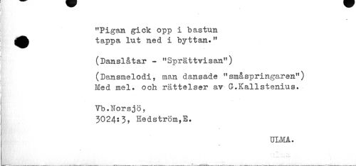 //// "Pigan gick opp i bastun ^^ tappa lut ned i byttan*" //// (Danslåtar - "Sprättvisan") //// (Dansmelodi, man dansade "småspringaren") Med mel. och rättelser av- G.Kallstenius. //// Yb.Norsjö, //// 3024:3, Hedström,E. //// a //// ULM A. ////
