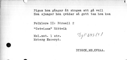 //// Pigan hon gångar åt skogen att gå Tall Hon sjunger hon qväder så gott tam hon kan //// Folklore Ils Börsell 2 "Getvisan" Rättvik //// Mel* no t. 1 str. / //// Moberg Excerpt. //// DYBE CK,MS,KVHAA. ////