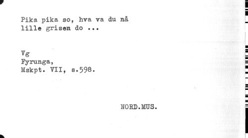 //// i //// Pika pika so, hva va du nå lille grisen do . //// Vg | //// Fyrunga, I //// Mskpt. VII, s.598. ¦ //// t //// i //// P ¦ //// NORD.MUS. I //// k ////
