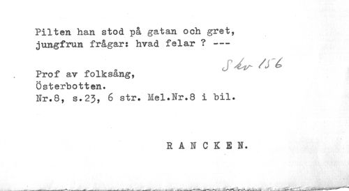 //// Pilten han stod på gatan och gret, jungfrun frågar: hvad felar ? --- //// Prof av folksang, Österbotten. //// Hr.8, s.23, 6 str. Mel.Nr.8 i bil. //// E A N C K E N. //// ---^ —*—b--,—*---—---___A. . ___A.___fcÉMÖJwaM*1 **** ////