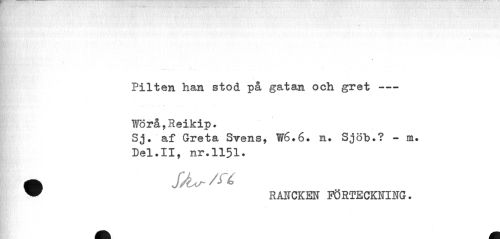 //// Pilten han stod på gatan och gret --- //// Fö rå ,Reikip. //// Sj. af Greta Svens, W6.6# n. Sjöb.? - m» Del.II, nr.II5I. //// m SÅ^/fi //// ™ RANCKEN FÖRTECKNING. ////