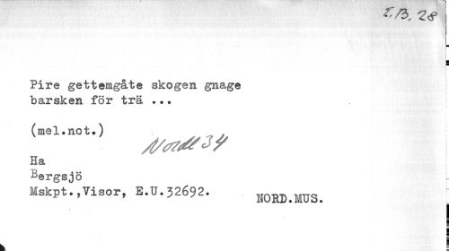 //// /a, 1<e //// ¦ //// i //// l 1 \ .•*'../' 7 1 //// Pire gettemgåte skogen gnage //// barsken för trä ... | //// (mel.not.) //// /t/^z? //// Ha //// ^ergsjö //// Mskpt.,Visor, E.U.32692. HORD MUS ¦ //// I //// | //// I //// ¦ //// g //// k = ////