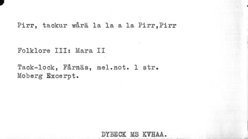 //// Pirr, tackur wårä la la a la Pirr,Pirr //// i //// r //// i //// Folklore III: Mara II //// ¦ //// i //// fack-lock, Fårnäs, mel.not. 1 str. Moberg Excerpt. //// DYBECK MS KVHAA. ////