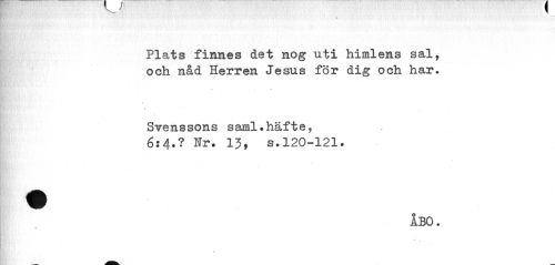 //// Plats finnes det nog uti himlens sal, och nåd Herren Jesus for dig och har. //// Svenssons saml.häfte, //// 6:4.? Nr. 13, s.120-121. //// ABO. //// Mr ////